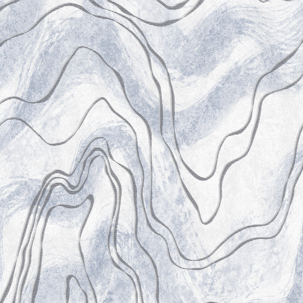 Abstract marble-style design with blue waves and black contour lines.